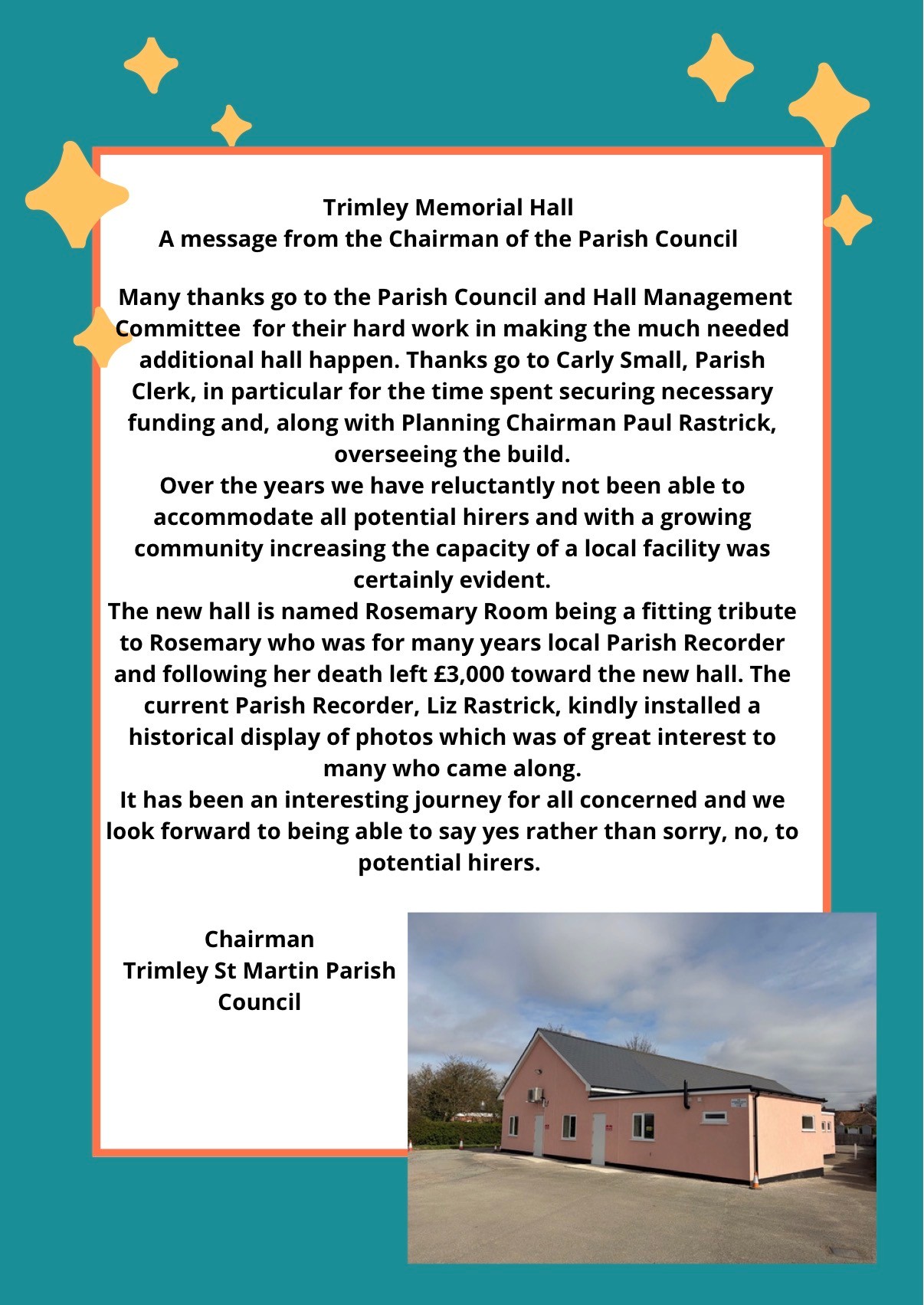 Back in 2021 Trimley St Martin Parish Council sent out a questionnaire to residents with regards to a possible extension on the Memorial Hall. Unfortunately, not many were returned, but those that were highlighted that they would be in favour of the Memorial Hall being extended.
