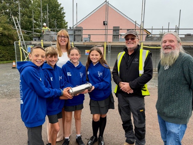 Photographed: Year 6 students Jack, Riley, Kiki and Madeline with Headteacher Mrs Ross handing the capsule to Chris from Oliva Contracts and Cllr Rastrick from the Parish Council.